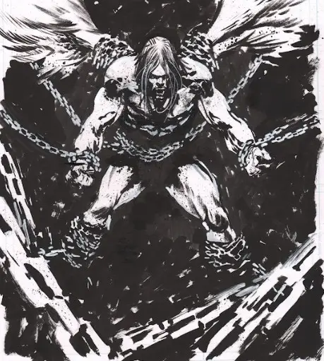 Alongside his fellow Watchers, Azazel was cast down into the Abyss of Duridel, a place beyond even the circles of Hell, where light dies and silence suffocates. There, he was bound beneath the earth, his body buried in stone, his wings bound, his voice silenced. The weight of creation itself holds him down, sealed by divine command to suffer for eternity.